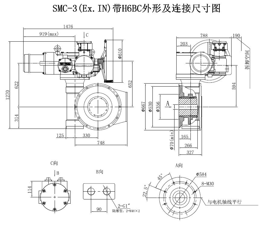 SMC/HBC系列電動裝置是SMC系列多回轉電動裝置與HBC蝸輪減速器的組合型式,它適合球閥、蝶閥等部分回轉閥門的驅動控制。SMC/HBC電動裝置具有以下特點:結構設計堅固可靠,產品規格齊全,驅動轉矩范圍大且動力輸出穩定, 具有良好的自鎖性能。 HBC輸出軸結構獨特,裝有與閥桿連接的漸開線花鍵接頭,產品的安裝調試方便。