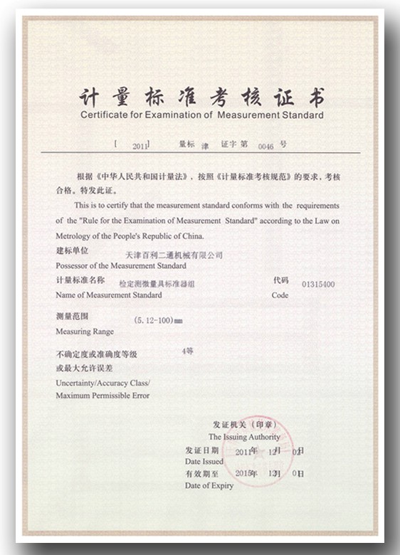 Certificate for Examination of Measurement Standard
