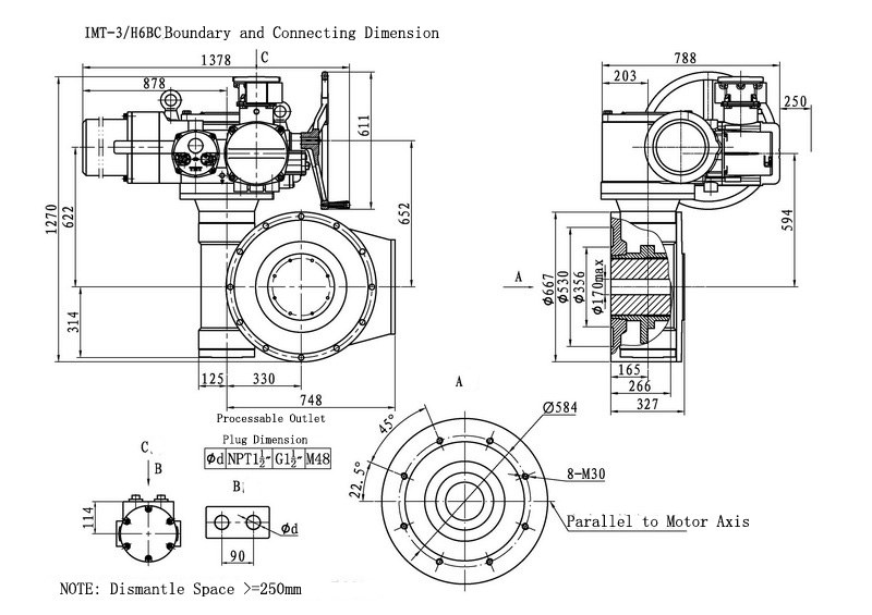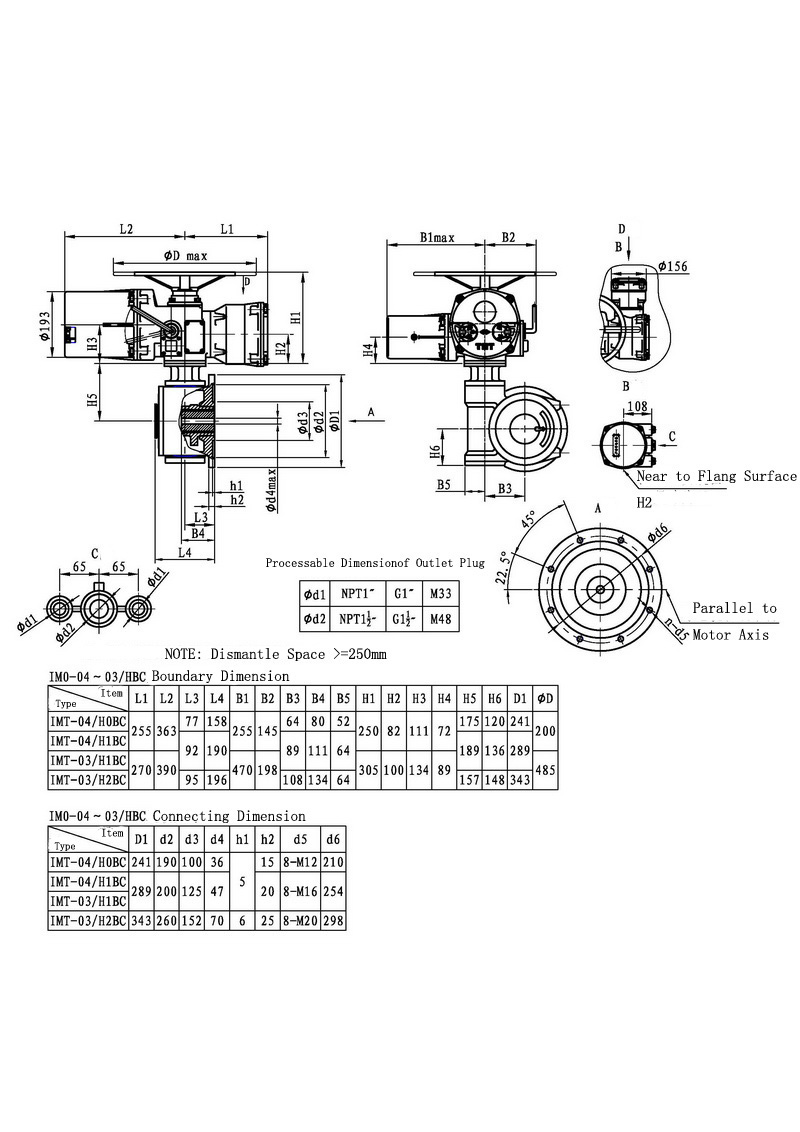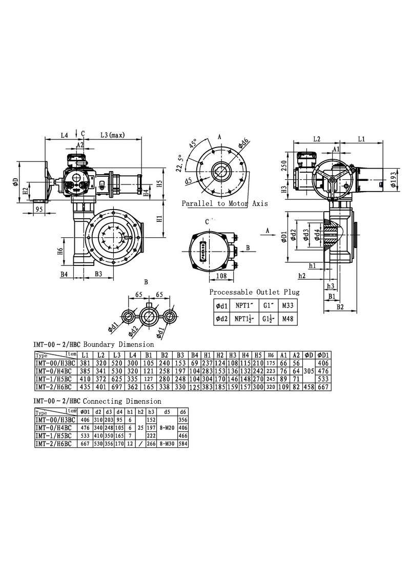 IMT/HBC series ,the combination of IMT series muilt-turn electric actuators and HBC worm speed reducer , was used to control ball valve ,butterfly valve and other part-turn valve actuators.This series actuators have features as firm constructure, multiple standard,large torque rang,stable output and self-locking ability.In order to gear into valve rod,HBC has a involute serration joint.It is easy to test and adjust.