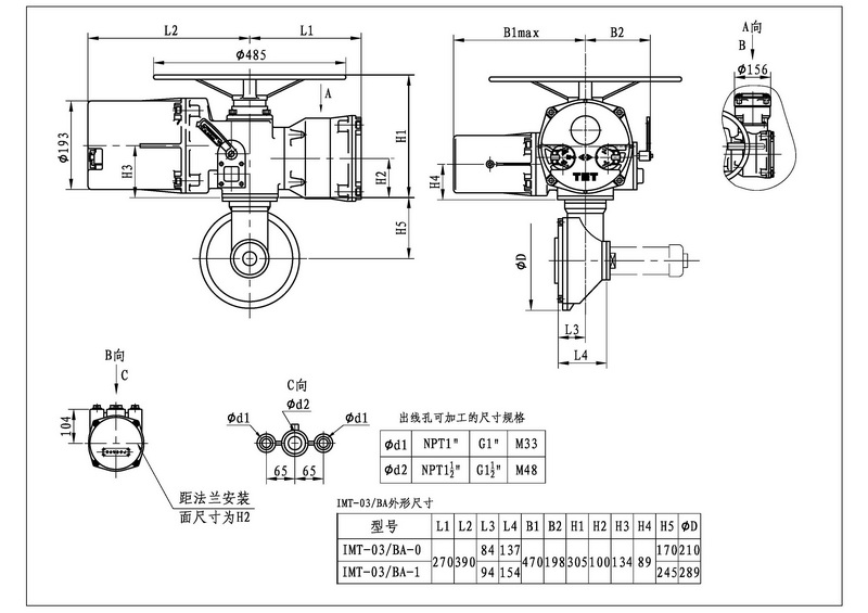 IMT/BA系列智能型電動裝置是IMT系列中小轉矩多回轉智能型電動裝置與BA圓錐齒輪減速器的一種組合型式,它適合閘閥、截止閥等多回轉閥門的驅動控制。IMT/BA智能型電動裝置具有以下特點:以較小轉矩規格的IMT電動裝置與BA減速器組合可獲得更大的輸出轉矩。在輸出轉速允許的條件下,選用該產品能夠提高所選電動裝置規格的通用性,便于產品的使用、維護。