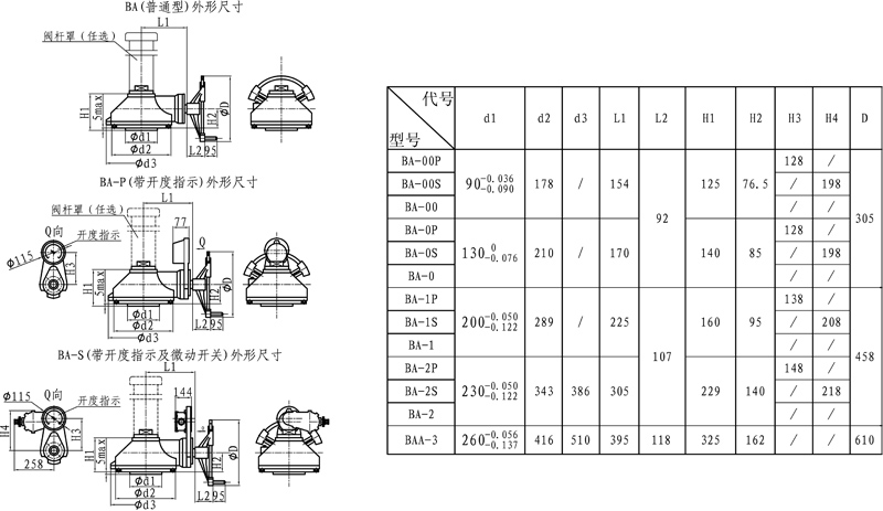 BA系列閥門手動裝置,是一種多回轉閥門驅動裝置,它適用于閘閥、截止閥等類型閥門。該裝置內部裝有閥桿螺母,而且在與閥門裝配后具有可方便地取出閥桿螺母的特點。閥桿螺母的螺紋形式及尺寸通常由用戶根據所配閥門自行加工。整機傳動效率高,安裝使用方便。
